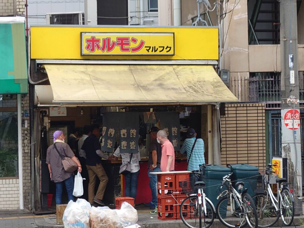 何となく分かるのである。西成の金のない労働者や地域住民に、物凄いコストパフォーマンスでホルモンを提供していただけの小体(こてい)の店が、ケニチを筆頭とした関西ユーチューバーの宣伝のおかげで?長蛇の列の店になり、それこそ、このような店などに近寄りもしなかったお嬢ちゃままでも来店するようになって、缶ビールや缶サワーをまんま口をつけ飲み、立って肉を流し込む。その輩たちが昔は鉄火場のオジサンたちぐらいしかやらなかった行為を平然とやらかしているのだから、店のご主人も天地がひっくり変える思いがしただろうと思うのである。ネットやユーチュブは、身の程をしりながら、静かに保守的な商いをしているもののスタイルを平気で壊してしまうという弊害もあるのだということを認識しなければいけないのだろう、などとしたり顔で語ってしまったが、再開を待って、いつの日か伺いたい。さて、どうするかと思案に暮れたが、打つ手はあったのである。「やまき」と並ぶ有名店「マルフク」があるではないかと、地図で調べる。歩いて3分ほどの近さの所にあるではないか「マルフク」がと、そちらに足を伸ばす。今度は迷わず到着。やはり人気店、大賑わいである。入れるかなと店を覗くと、カウンターを背にした壁側が空いていた。すぐにそちら向かうと、何やら客の数人が私の方を見つめている気配。外者で、そして大阪人ではないというのが私の立ち振る舞いで察したのか、私も自意識過剰になる。ここだけではなく大阪上陸をしてから、大阪もんではないなという他者の視線を、思い込みかもしれないが、気のせいか感じるのである。何とか気持ちを立て直して、瓶ビール(450円)注文。すぐに633の大瓶スーパードライが到着。安い633がこの値段とは。メニューを眺めると、全てが嘘のような価格(ホルモンが160円にレバー160円、豚ハラミ250円、牛ハラミ320円)。少し恐ろしくなったので、まずはホルモンと牛ハラミと煮卵を注文して、どの程度のものか試してみようと、しばし待つ。2分ほどで白いパック容器(最近安い東京の焼き鳥屋もこの容器を使用しだした)に入った品が到着。量もそれなりにある。さてまずは、ビールを飲みながらホルモンを流し込む、そしてハラミと交代に口に入れる。う~ん、何と表現してよいのやら、さすが安いだけあって、質の良いホルモンではない。ハラミも同様に安かろうというものである。タレもそれほどのことはない。まあ、これだけ安価なのであるから文句は言えないが、関西ユーチューバーに一言もの申したいが、悪口を言えないのは分かるが、「びっくりするぐらいの旨さだとか」「すごくおいしい」「ぜんぜん臭みがない」などと御託を並べているが、確かに臭くはないが、確実に肉は活きていない。レバーを塩で注文していた猛者がいたが、おい大丈夫かと、声をかけたくなったのである。学食の肉を塩で食べる奴はいないだろう。最近関西のホルモン焼き屋が鳴り物入りで東京に進出してくるが、余り芳しくないのは、この程度だからなのか(鶴橋は違うと思うが)、やはり東京では無理なように思う。安いのは確かだが、西成だけの通用かも。最後はニンニクと一味をこれでもかとぶっ掛けて喉を通し、煮卵をさっと口に含み退散したのであった。私の後ろのカンターでは、スラリとした美しい30代ぐらいの女性が一人で飲んでいたが、浮世は時代とともに変化していくのだと実感したのだった。そして、またもや大阪食い倒れに裏切られ、首を垂れながら、あべのハルカスのビルを目指して西成を後にしたのであった。しかし、これからの西成ドヤ街の行方は常に注目してゆきたいものである。戦後の日本の発展はここで働いていた人の力があったからこそなのを忘れてはいけない。そして鉄板ホルモン焼きは西成のソウルフードなのは確かなのであろう。ソウルフードとは旨いとか不味いとかの基準では測れない奥深いものなのである。