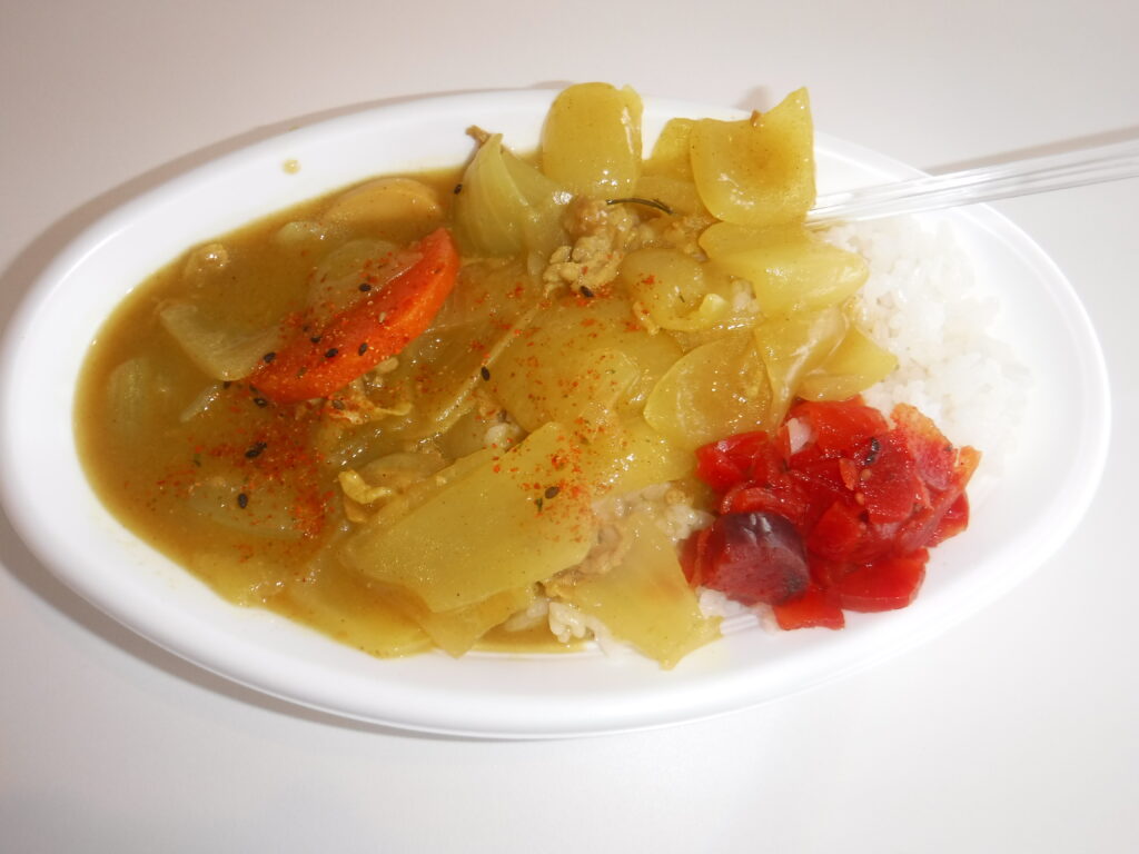 しかし、さすがにこれを紹介せずに、浦和競馬場の鉄火場飯は語れないだろうと思い、清水の舞台から飛び降りる覚悟で浦和競馬場まで来たのである(嘘です)。以前は先述の古びたスタンドの下に店を構えていたと記憶していたのが、それがないとなると、「里美食堂」はどこへ行ってしまったかと案内板を見ると、ありました、ありました。我が2号スタンドの1階にあるではないか「黄色いカレー」が、と私は階段を降りるのだった。お店はセルフスタイルで、立ち食い形式に変わり、以前は観光地の食堂的雰囲気で深い味わいがあった店だったように思ったが、何だが整然としまいツマラナクなったような。しかし、これも世の常だと、カレーの並(600円)とオジサンに伝えると、お母さんが調理をし、数分で、目の前に「黄色いカレー」が現れる。福神漬けをのせ、窓際のテーブルに運び、まずは俯瞰してまざまざと眺める。記憶違いか、昔はもっと黄色かったようにも感じるが、きっと錯覚で、変わっていないのだろう。カレーの具材は玉ねぎと大きな人参、マッシュルーム。さて実食と口に頬張る。ん~カレーなのだが、スパイシーさはほとんどないが、ショウガの香りがほのかにする。カレーシチューが乗っかっているという感じ。学校給食のカレー汁をもっと薄味にしたような、と形容したほうがピッタリするかもしれない。この「里美食堂」は浦和競馬場開場当時からあるというので70年の歴史はあるらしいが、その当時からカレーの味を変えてないのではと思う。そうきっと戦後のすぐの頃はこんなカレーを食べていたのだろうと想像できる。そうすると、この味でも納得がゆくのである。こういうカレーは味変しなければと七味とウスターソースを掛ける。ウスターソースとは非常に相性が良い、ということで、この食レポを終わらせていただく。