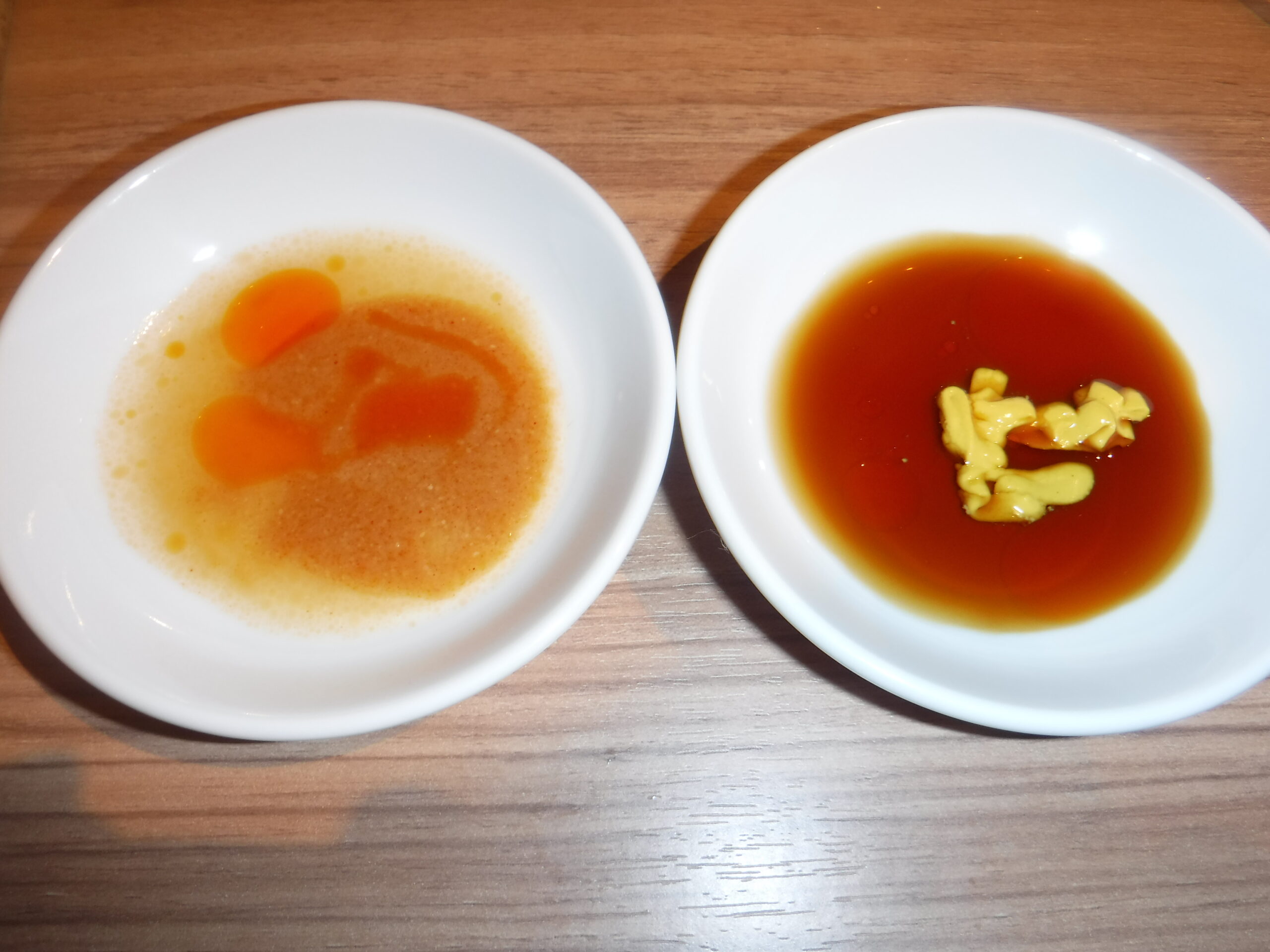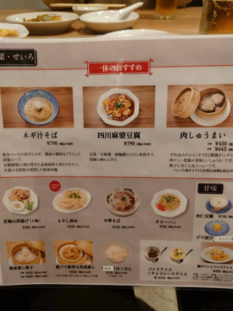 また何故どこでも食べられる餃子を選択したのか。実はこの神戸、宇都宮や浜松には劣るが、餃子の街ということ。そして、味噌だれに付けて食べるというのが特徴だという。味噌だれは、今やそれほど珍しいものではないが(大阪王将を筆頭に東京でも味噌だれを出す店は少なからずある)、この味噌だれで食べるは神戸が発祥なのだそうだ。それならば神戸の味噌だれぎょうざはどんな塩梅なのか、試さなければローカルフード研究家としては沽券にかかわると…?。これがあえて高級店は止めて餃子屋さんにした理由のひとつなのである(ホントか)。そして、清潔な白い大きな暖簾に朱色で一休の文字、全面ガラスばりで、ちょっと気になるが、元気でよろしいと偉そうな態度で入店したのであった。雨なので使用してないが外にはテラス席もある。店内は広々とした打ちっ放しの空間に4人掛けの卓子が7、8卓ほど並ぶ。他の客と丁度良い隙間が、余裕と落ち着きを与え贅沢感さえ醸し出している(親指上げ)。まだ開店(17時開店)早々なので、先客は2組5人ほど、端の卓子に通される。まずはザーッと菜譜(メニュー)を眺める。餃子はこだわり餃子、にんにく餃子、しそ餃子、水餃子。その他シューマイ、四川麻婆豆腐、若鶏の唐揚げ、蒸し鶏などの一品料理が並ぶ。ご飯とのセット料理も充実しており、もちろんラーメン(ねぎ汁そば)もある。卓上調味料を眺めると、ありました味噌ダレが入った容器が。