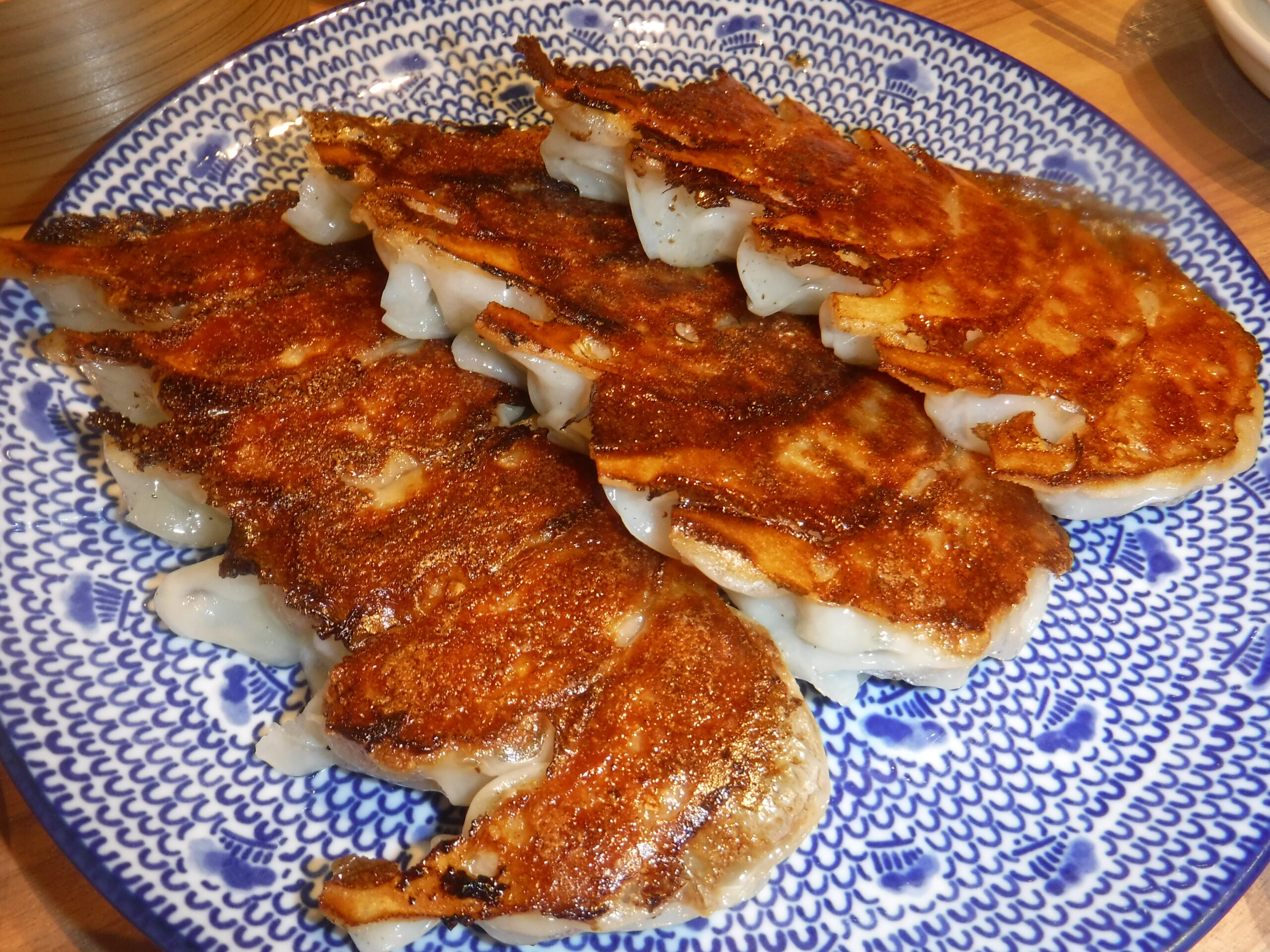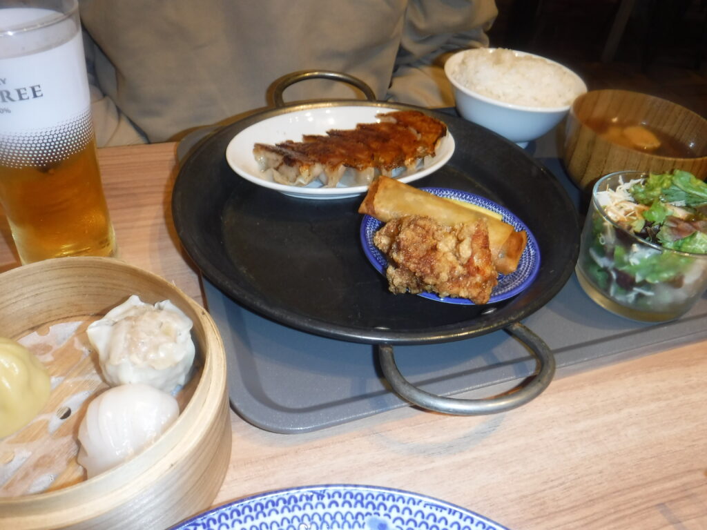 そして、こだわり、にんにく、しそのオリジナル餃子を1人前ずつ注文。K氏はここの一番人気の定食、点心爛漫セット(餃子、点心3品<海老蒸し餃子、貝柱焼売、かに小籠包>。春巻、唐揚げ、サラダ、みそ汁、ご飯)をチョイスし、しばし談笑して品を待つ。