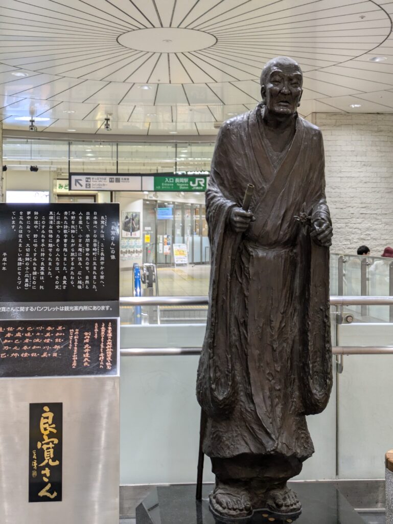 朝5時起きして上野駅へ、青春18切符を買い、行きは鈍行で向かう。高崎線で高崎駅まで、上越本線で越後湯沢で乗り継ぎし、一度長岡駅で下車、長岡をぶらついて、新潟五大ラーメンのひとつ長岡生姜醤油ラーメン(「「燕背脂」「新潟濃厚味噌」「新潟あっさり醤油」「三条カレー」)を食べて新潟市へという計画。新潟まで凡そ9時間の列車旅である(我ながら元気だなと感心する)。ホテルはアパホテルを予約。3泊4日の堂々たる新潟ソウルフードの旅を敢行したのであった。午前11時頃に長岡駅着、ちょうどラーメンを食べるのには絶好の時間、というか、ただ、この時間に合わせて出発したのである。長岡は高崎と同様、駅前は閑古鳥状態。さてラーメンでもと思ったが、生姜醤油ラーメンの有名店は皆車で移動しなければならないところばかり、こりゃ駄目だと、生姜醤油ラーメンを提供しているところならどこでもと駅前のラーメン屋を探すが、これがないのである。やっとこ見つけたのが東口の駅前の「いちまる」なる店。夜は居酒屋使用風で、地元の人には使い勝手はよさそうだが、本格的なラーメン店の装いはない。しかし、まあいいかと入店。豊富なメニューから生姜醤油ラーメンと餃子を注文。さていかなるものが出てくることやらと、しばし待つ。数分でラーメンが到着。見た目もほうれん草が入って以前数回食べた、生姜醤油ラーメンと同似である。まずはスープを一口、濃い目のかえしに生姜の香がほんのりとして結構な塩梅。以前食べた秋葉原の青島食堂(長岡青島食堂の支店)の生姜醤油ラーメンと比べるとパンチはないが、まあ、これはこれでアリかなのレベル。麵も細目のいくらか縮れた感じで悪くない。遅れて餃子が到着。餃子も可もなく不可もない、餃子などはどこもこんなもの。期待をしていなかったのが吉とでて、まずは満足な品であった。やはりラーメンに力を入れている県なので、どこも、そこそこ平均点を越えたものを出すのかもしれない。夜は居酒屋になるし、自宅の側(そば)にこういう店があれば何度も通うだろうな、と店を出て駅へ。駅構内に尊敬する良寛(長岡市出雲崎出身)像があったので拝礼して、さてイザ新潟市へとまた列車に乗ったのであった。