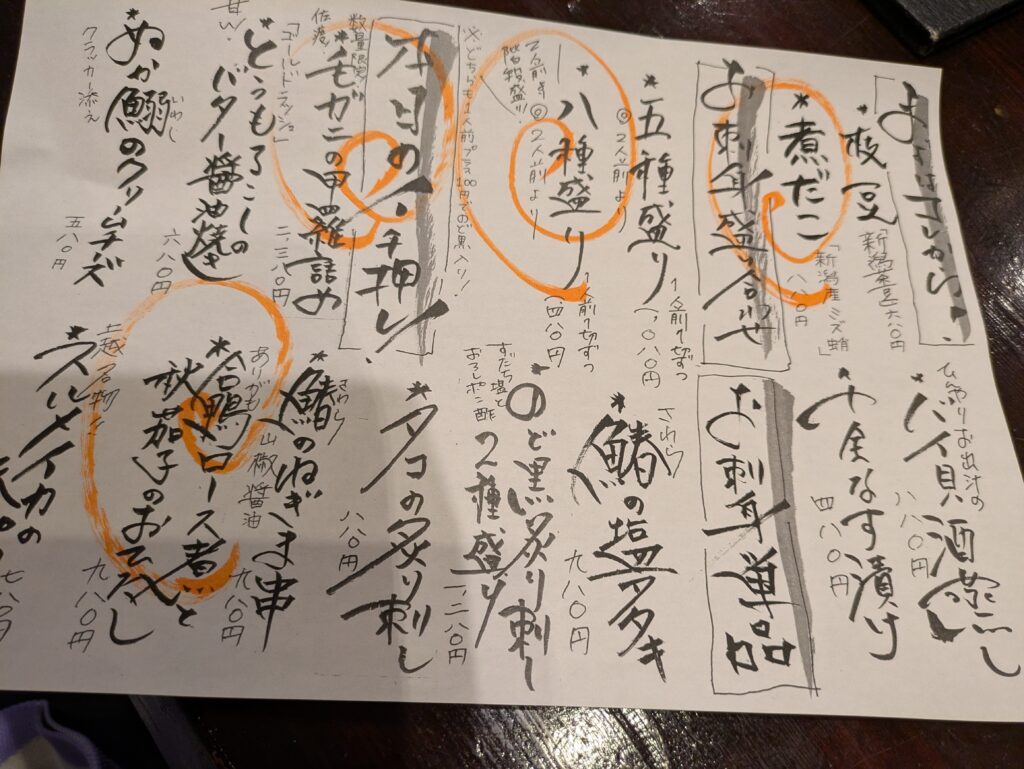1日目は本町の笹口1~3丁目周辺の繁華街を冷かすことに。さすが酒処だけあって、良さそうな居酒屋がところ狭しと並んでいる。これは予め店を決めておいて良かったと、「十郎」へ向かった。「十郎」は宿に程近い東大通りにあった。店の前に新潟の酒蔵の大樽が並び、如何にも銘酒屋という佇まい。奥の10畳ほどの座敷に通される(4人掛け卓5つ)。店内も古民家風で味わい深い。まずは生ビールを頼み、風呂上りの喉を潤しながら、ざーっとメニューに目を通す。どれも心惹かれるものばかりが並ぶ。まずは刺身の五種盛とカニ味噌を注文する。生ビールがすぐに空になったので、追加で麒麟山サワー(新潟一ポピュラーな日本酒だそうだ)をオーダー。まずはカニ味噌が着。さすがにこれは日本酒のツマミだ。