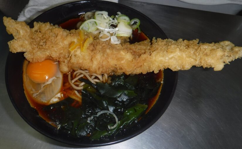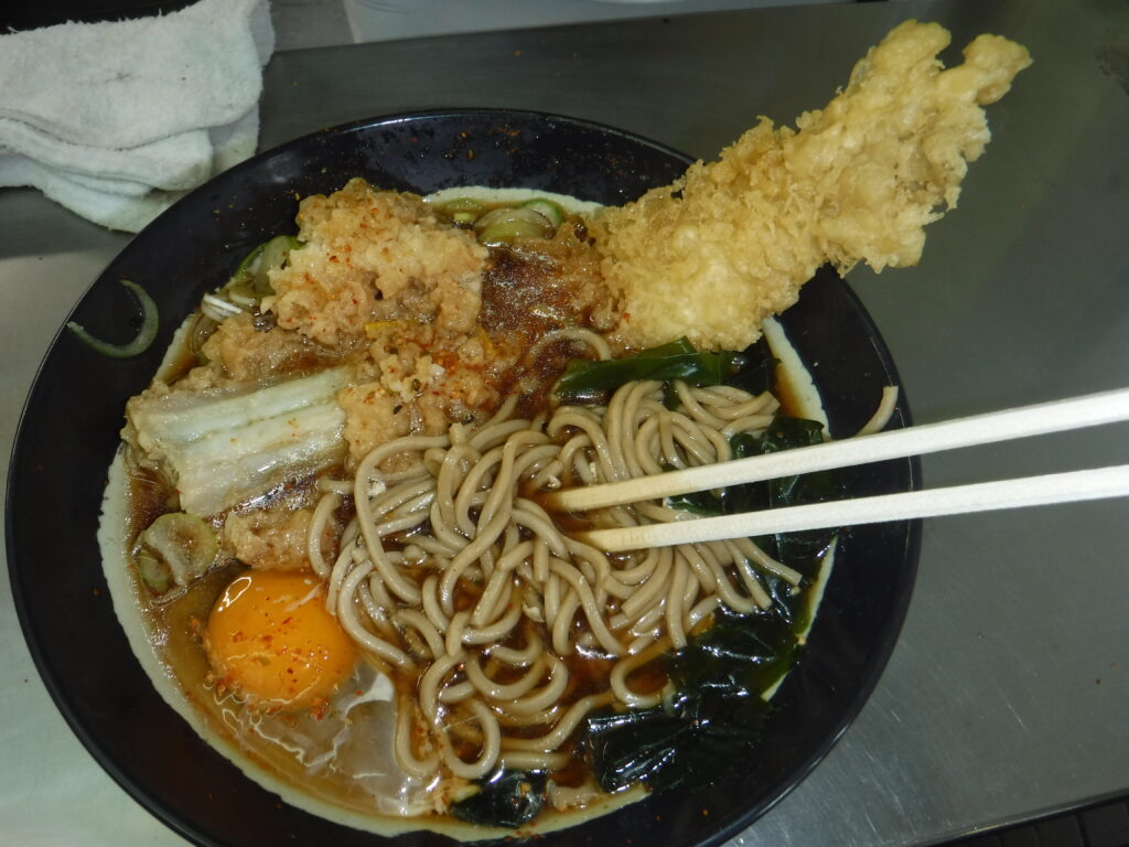 その当時は、ホームに立ち食いそば屋があるのさえ気づかなかったが、きっと食べていたのだろうが忘れてしまっていたのであろう。それではと過去の記憶を辿りながら、日栄軒の暖簾を潜ることにした。京浜東北線の下りホーム、横浜よりということで、その辺にめどを立てホームを降りると、それらしきものがすぐに見つかりました。こじんまりとした店で、店内5,6人のスペースのカウンターがあるばかり。時分時をさけたので、お客さんはオジサンの他に2人。老舗駅そばということの他、現在この店の名を高めているのが2005年から始めたという穴子天。丼からはみ出すほど、どーんと1本ままの大きさだという。それではとこの穴子天そばにタンパク質を摂るため生卵のチケットを購入し入店。小さな店内で待つこと1分、穴子天そばが目の前のカウンターに置かれる。こりゃBIGだのーと心で呟きながら、まずは穴子を少し横に移し、そばを手繰る。そばは立ち食いによくある6(そば粉):4(うどん粉)ぐらいの品。そして汁(ツユ)はカツオのだしに濃口醤油の関東スタンダード。それでは穴子天を箸で切り口に、う~ん身は薄い。まあ、当たり前だがこんなものである。この値段(650円-取材時)で、そんな凄い穴子が出たら、ひっくり返ってしまう。最後に生卵を溶かしマイルドにし美味しく頂かせていただきました。